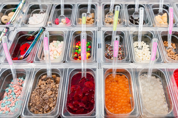 Chocolate Chips, Sprinkles, Reese Pieces, Graham Crackers, Fruit Poppers, Wafers, M & M’s, Coconut, Granola, Fruity Pebbles, Chocolate Syrup, Vanilla Syrup, Caramel, Hot Fudge and many many more toppings.